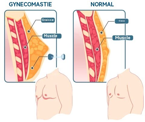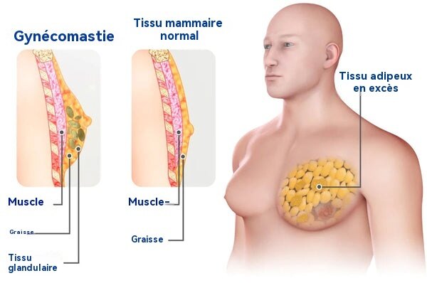 La gynécomastie est le développement excessif du tissu mammaire chez l'homme. Elle survient en cas de déséquilibre hormonal, notamment une augmentation du taux d'œstrogènes ou une diminution du taux de testostérone. Ce phénomène peut se produire à tout âge, mais il est plus fréquent à la puberté et plus tard dans la vie.
