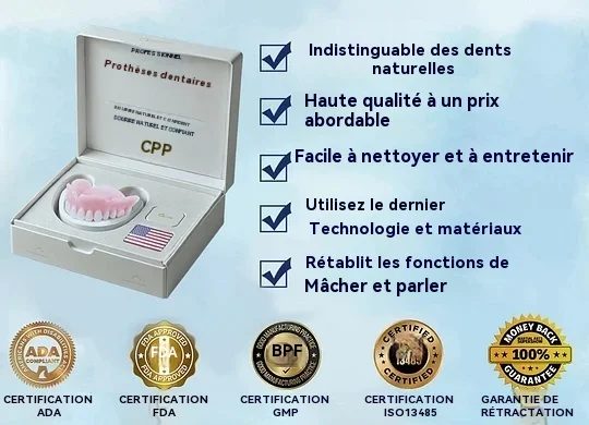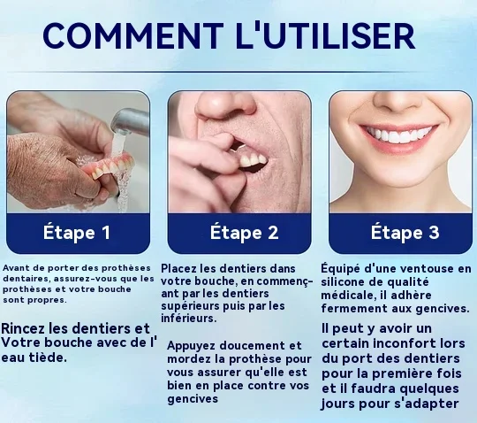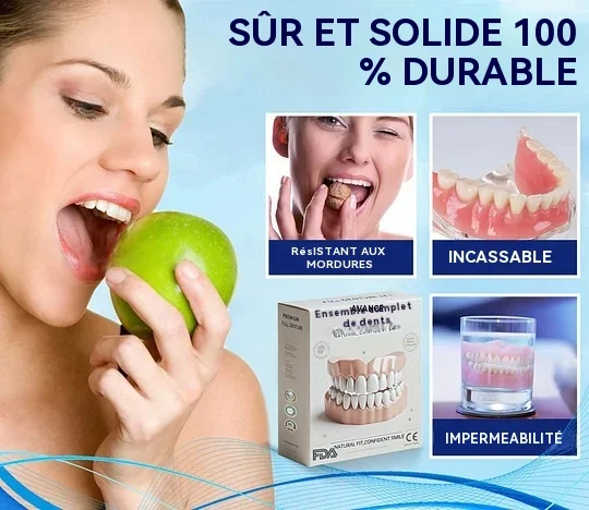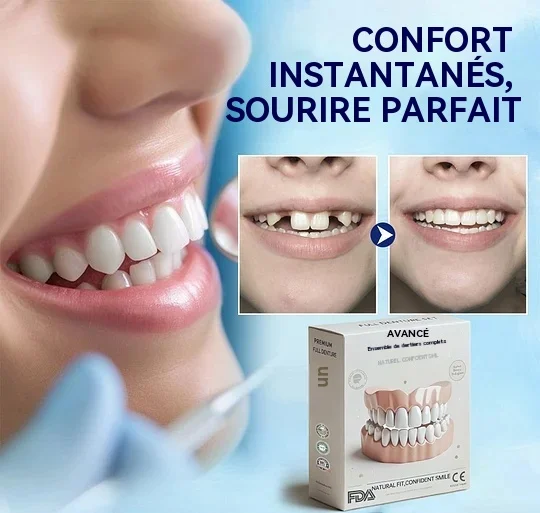 Ajustement facile. Confort optimal : Profitez de prothèses dentaires qui s'adaptent parfaitement à votre bouche dès la première utilisation. Notre conception innovante assure un maintien sûr et confortable, pour une sensation naturelle. Vous pouvez ainsi vaquer à vos occupations en toute confiance, sans aucune gêne ni déplacement, et manger, parler et sourire en toute sérénité.